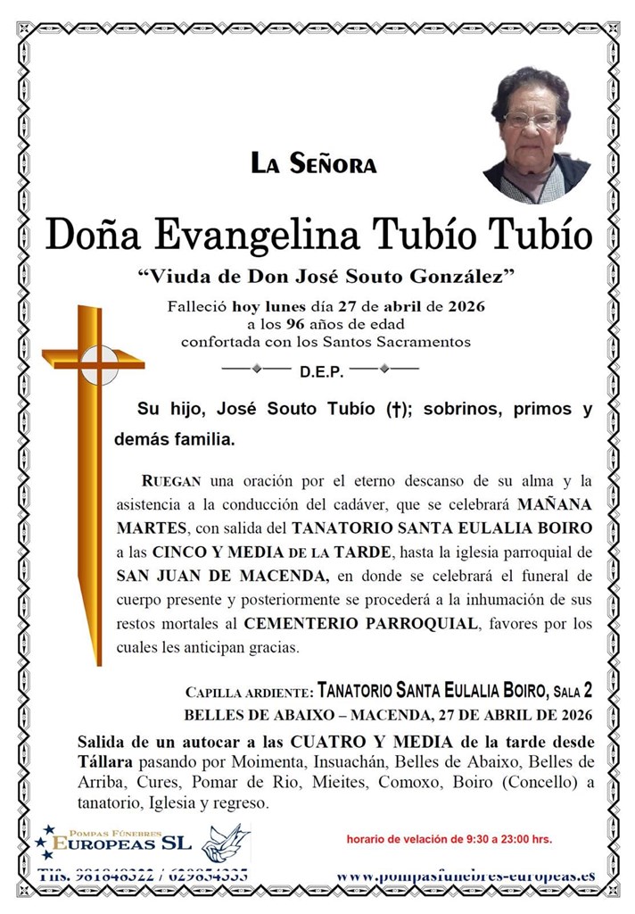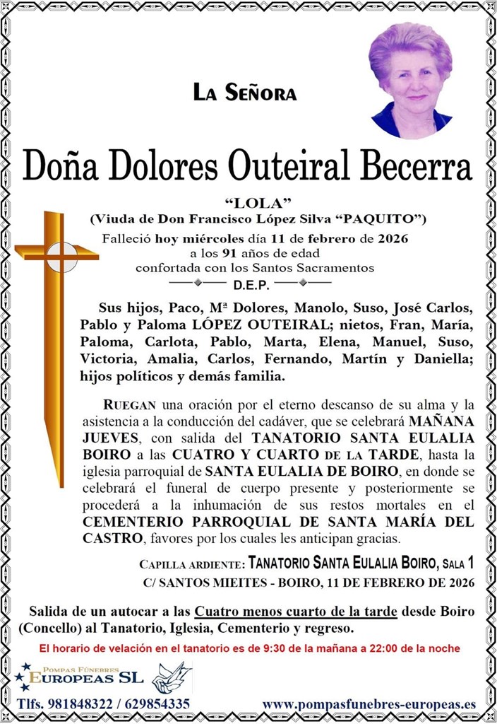Pompas Fúnebres Europeas es una empresa dedicada exclusivamente al sector funerario con tanatorios en Vilagarcía de Arousa, Boiro, Rianxo, Urdilde y salas velatorias en Bandeira. Contamos con una amplia experiencia en el sector, de más de 40 años, que avala la calidad de nuestros servicios, centrados principalmente en asistir de una forma profesional y seria a los familiares en estos duros momentos.