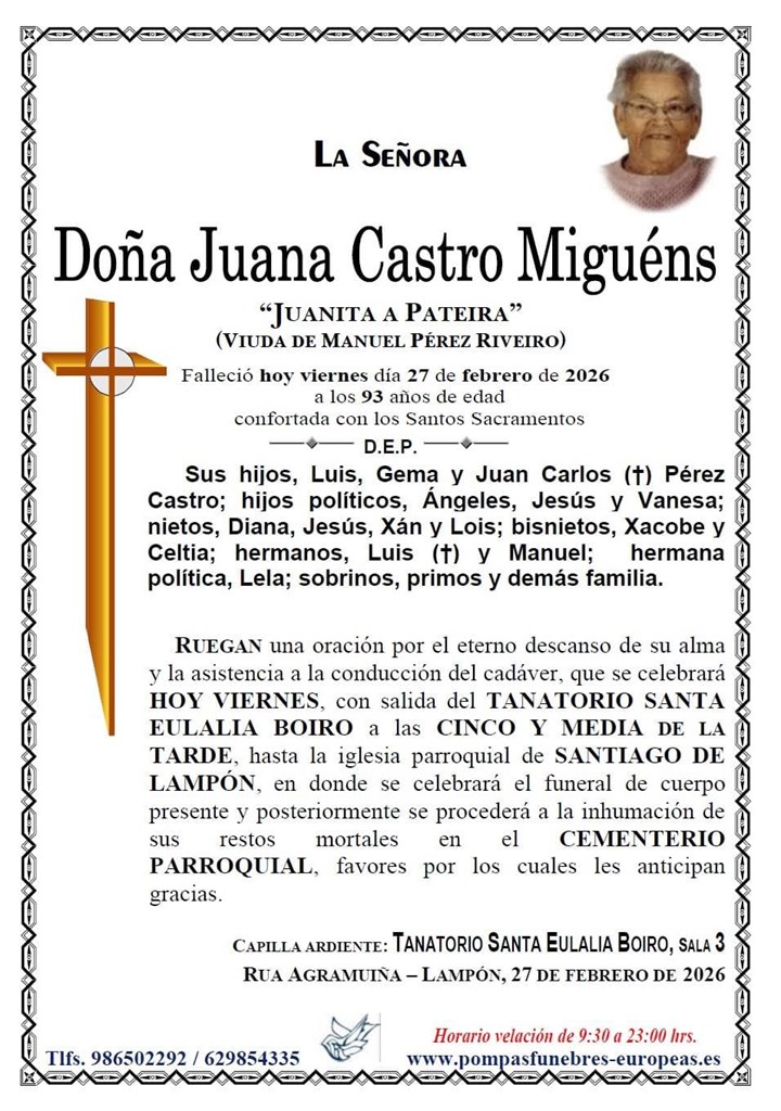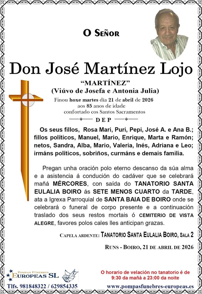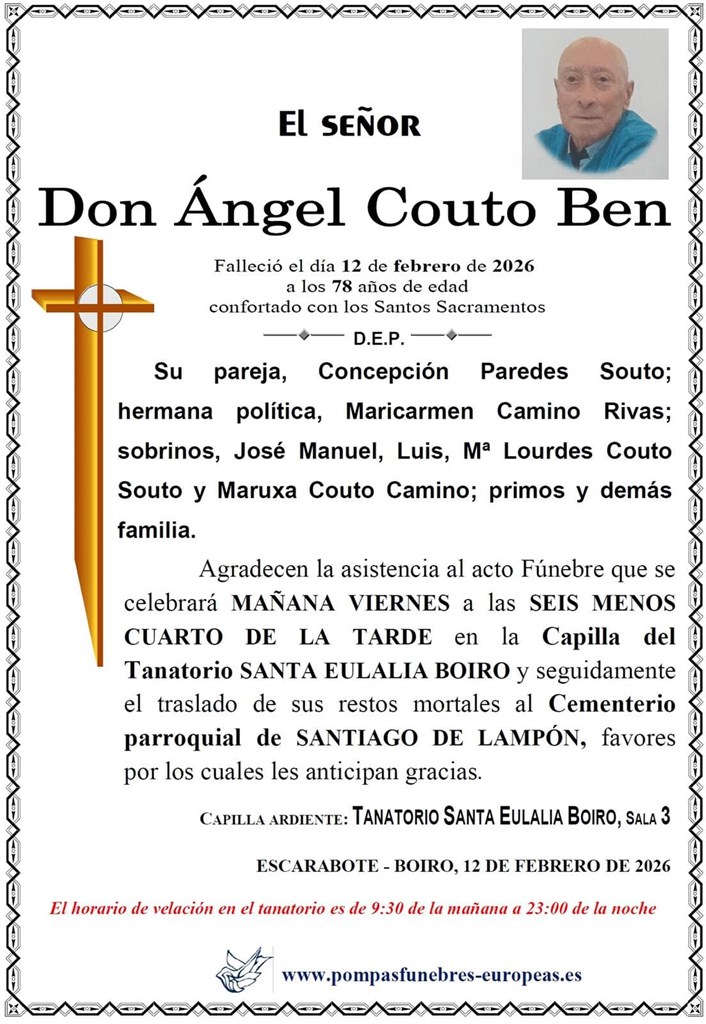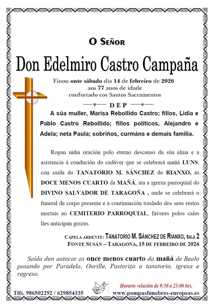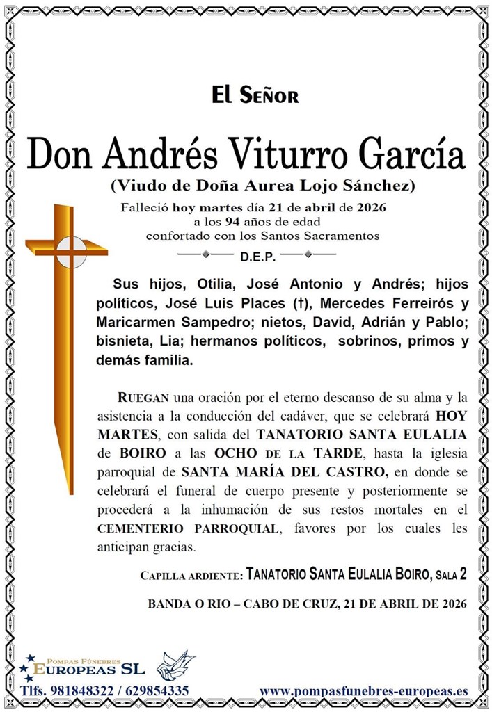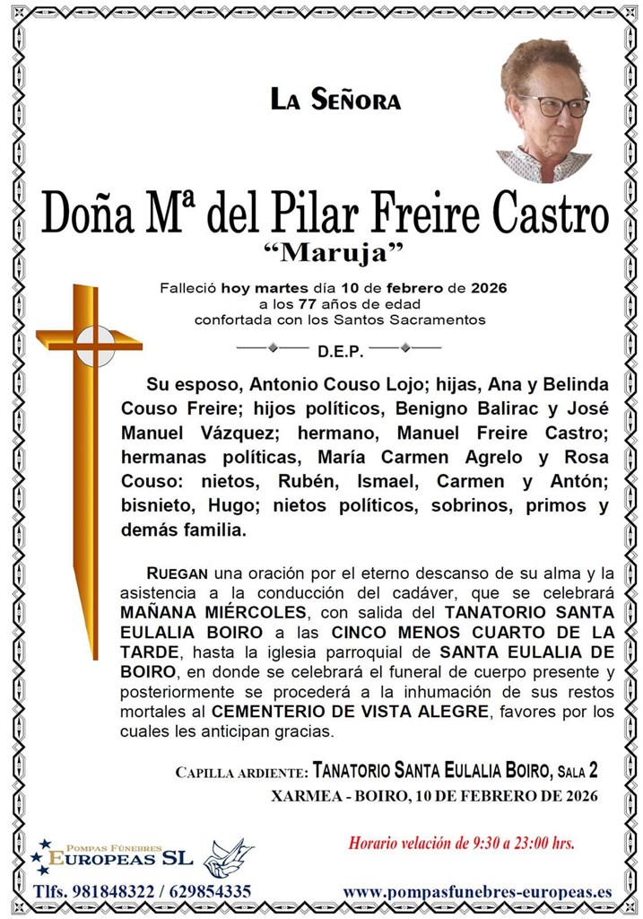 Pompas Fúnebres Europeas es una empresa dedicada exclusivamente al sector funerario con tanatorios en Vilagarcía de Arousa, Boiro, Rianxo, Urdilde y salas velatorias en Bandeira. Contamos con una amplia experiencia en el sector, de más de 40 años, que avala la calidad de nuestros servicios, centrados principalmente en asistir de una forma profesional y seria a los familiares en estos duros momentos.