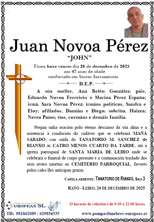 Juan Novoa Pérez Tanatorio Rianxo - M. SánchezSALA 03 O Pazo, 86 - Rianxo(ver en mapa) Telf.24H: 986 502 292 | 981 862 089 26/12/202527/12/2025 Información Finou hoxe 26 de decembro de 2025 aos 47 anos de idade. Pregan unha oración polo eterno descanso da súa alma e a asistencia á condución do cadáver que se celebrará MAÑÁ SÁBADO, con saída do TANATORIO M. SÁNCHEZ de RIANXO ás CATRO MENOS CUARTO DA TARDE, ata a igrexa parroquial de SANTA MARÍA DE LEIRO onde se celebrará o funeral de corpo presente e a continuación traslado dos seus restos mortais ao CEMITERIO PARROQUIAL, favores polos cales lles anticipan grazas. Archivos adjuntos ESQUELA JUAN NOVOA PEREZ.jpg Eventos Iglesia y cementerio Iglesia de Santa María de Leiro Leiro - Rianxo(ver en mapa) Salida el sábado a las 15:45 horas. Envía sus condolencias con un mensaje o con flores Envíar floresFloristería online con envío gratuito Enviar pésameSu mensaje llegará a la familia del fallecido Pésame para la familia de Juan Novoa Pérez Selecciona un mensaje de pésame para cargarlo El motivo de este mensaje es expresarle mis más profundas condolencias por el reciente fallecimiento. Deseo que su alma descanse en paz y que encuentren pronto la resignación por tan enorme pérdida. Nos ha impresionado el reciente fallecimiento. Le acompañamos en su sentimiento ante tan irreparable pérdida. Apenas me acabo de enterar del lamentable fallecimiento. Dios le ayude a soportar tan gran ausencia. Siento sinceramente el reciente fallecimiento. Le envío un fuerte abrazo. Les envío mi más sentido pésame. Les acompaño en su dolor. Una gran persona, ejemplo vital para otras muchas; que su recuerdo permanezca y su trayectoria sea recordada. Condolencias a toda la familia. Mostrar pésames más habituales El titular de la página informa que los datos de este formulario serán tratados para ofrecerle la información solicitada, siendo la base legal del tratamiento el consentimiento otorgado por el usuario. No se cederán datos a terceros. Puede ejercer los derechos como se explica en la Política de Privacidad. Defunción Juan Novoa Pérez. Esquela, ubicación tanatorio, funeraria, horarios iglesia y cementerio. Envío de pesames online y servicio de floristería (flores, ramos, coronas, centros florales..) para enviar un último recuerdo y condolencias a la familia de Juan Novoa Pérez. Información sobre las misas y el entierro del difunto así como del velatorio y la capilla ardiente.